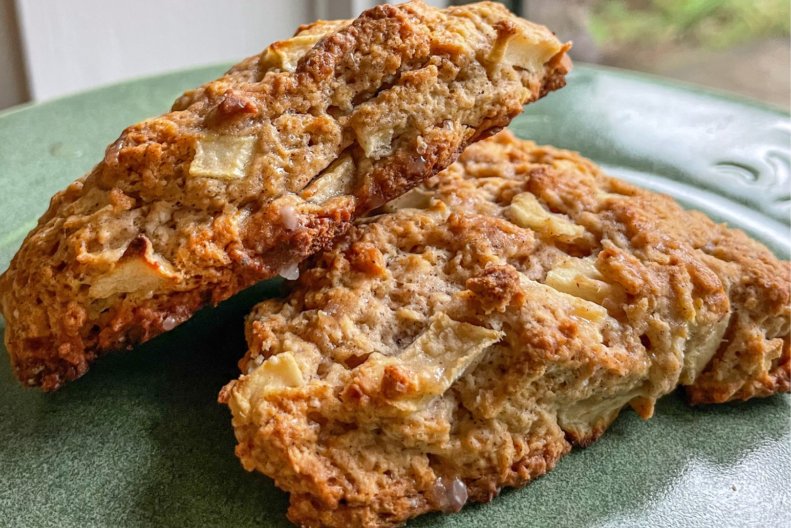 Gehakte Reinette-appels worden met kaneel en nootmuskaat door het beslag gevouwen en gebakken tot zachte en boterachtige scones — perfect bij een kopje thee.